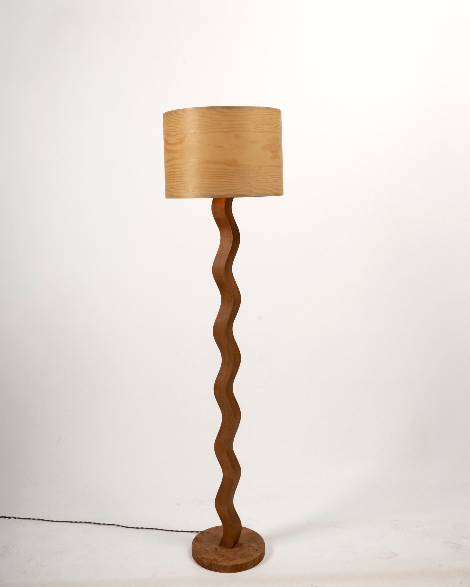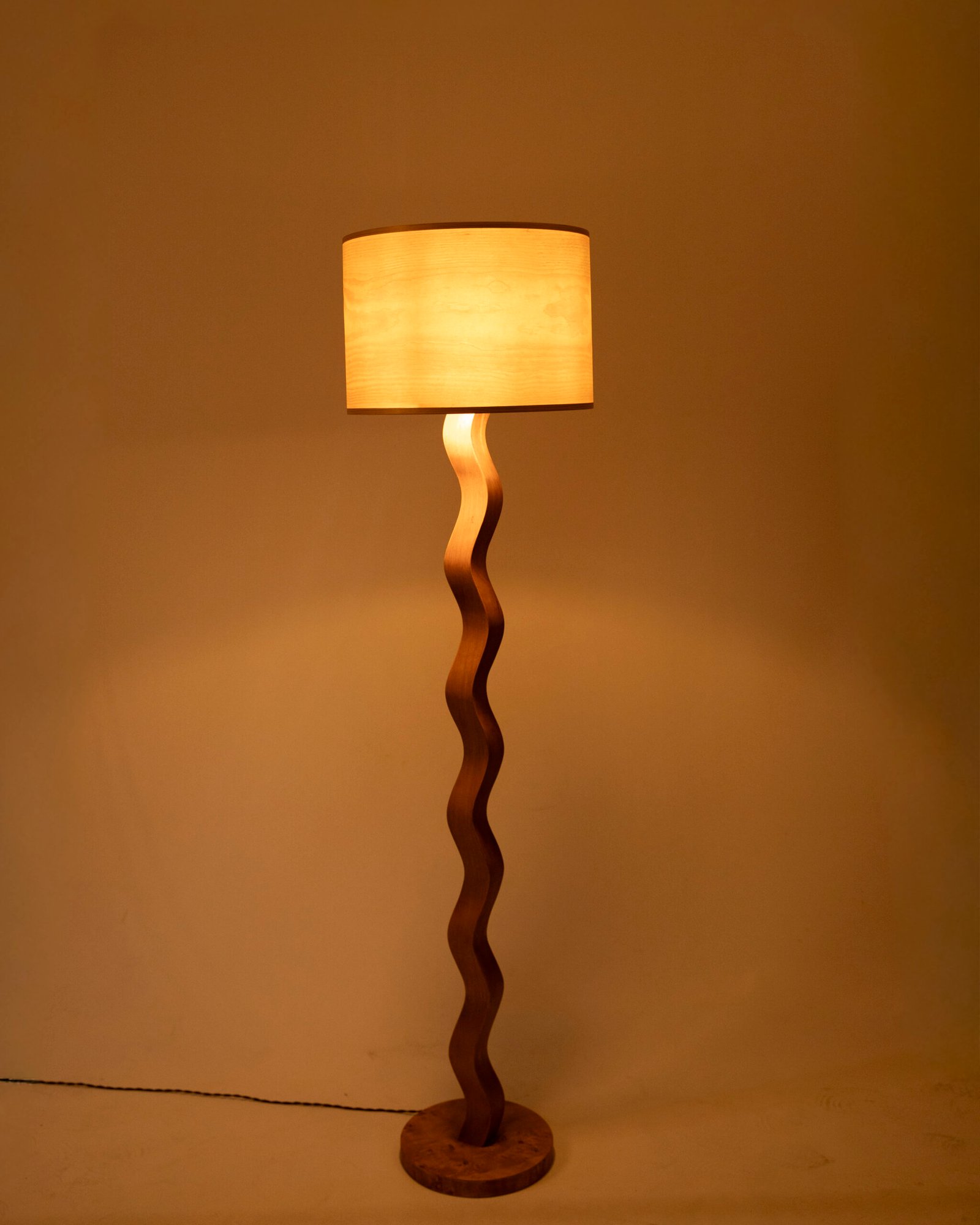 Lámpara de Pie de Madera de Pino KAARME es una pieza de iluminación artesanal fabricada con chapa de madera de pino de alta calidad. Esta lámpara de pie de madera de pino ofrece una luz cálida y equilibrada, creando un ambiente elegante en interiores modernos.